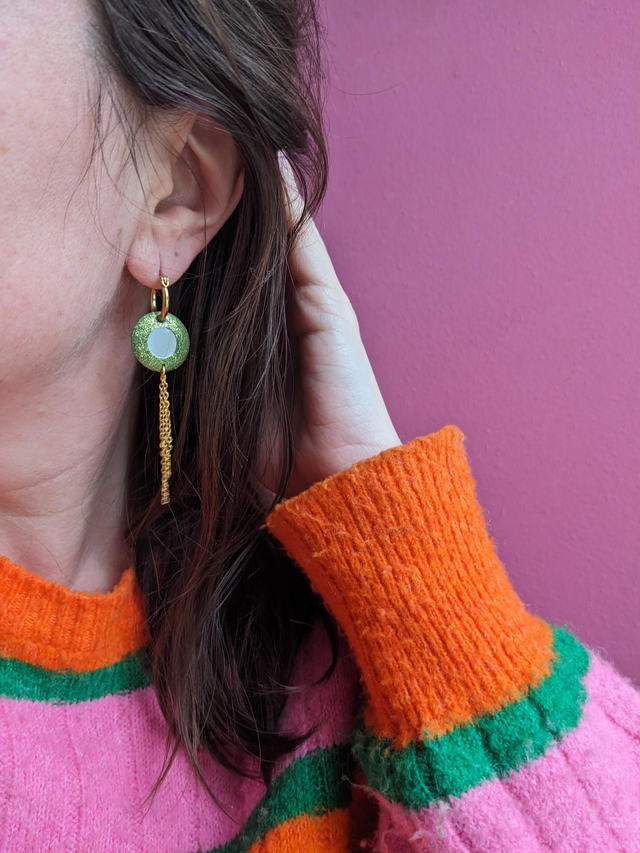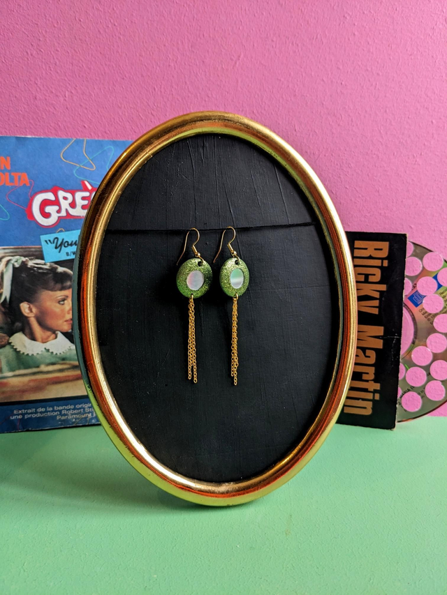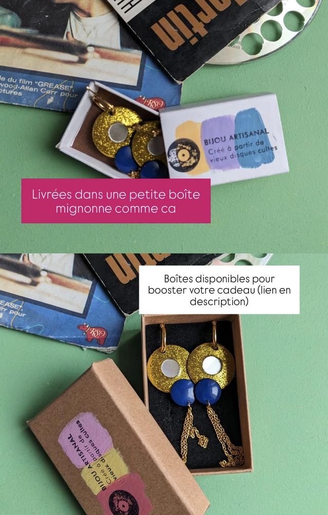 Ces boucles d'oreilles sont fabriquées à partir de vinyles 45T et CD cultes, transformés en bijoux uniques et responsables. Chaque pièce est créée par mes soins dans mon atelier artisanal à Septeuil (78)
