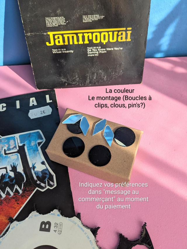 Ces boucles d'oreilles sont fabriquées à partir de vinyles 45T et CD cultes, transformés en bijoux uniques et responsables. Chaque pièce est créée par mes soins dans mon atelier artisanal à Septeuil (78)