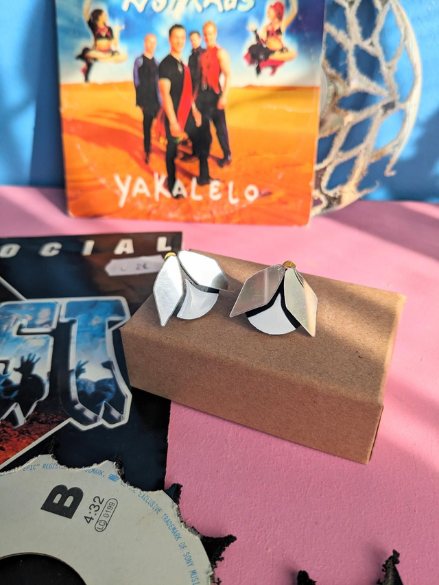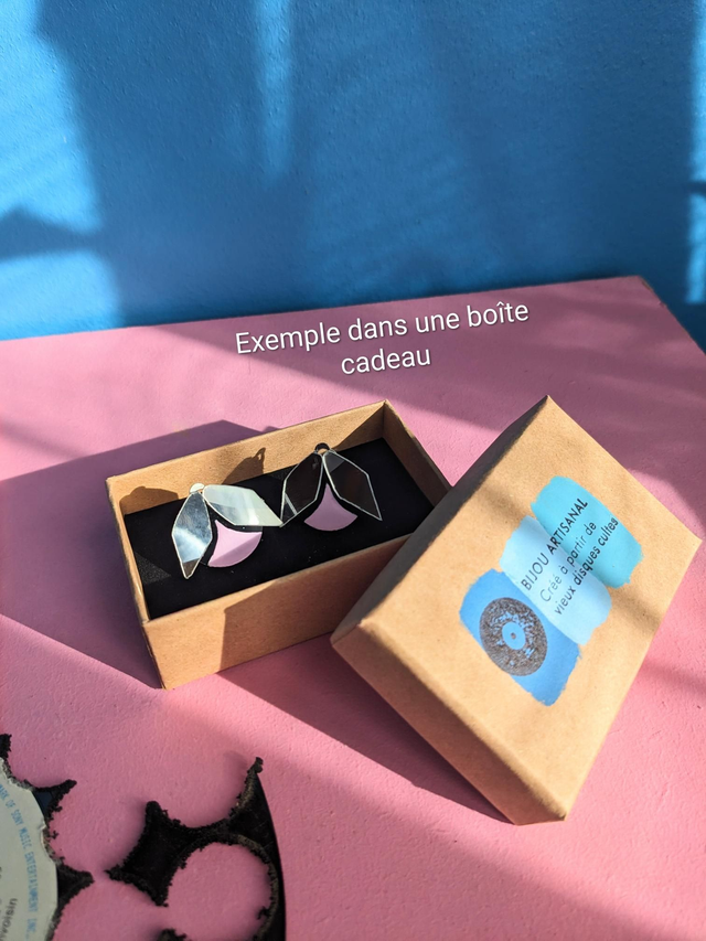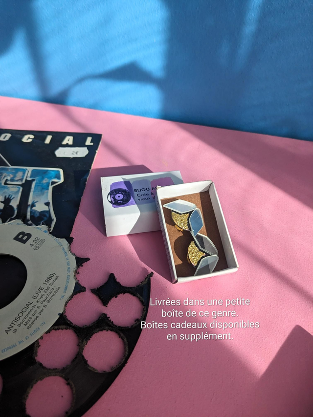 Ces boucles d'oreilles sont fabriquées à partir de vinyles 45T et CD cultes, transformés en bijoux uniques et responsables. Chaque pièce est créée par mes soins dans mon atelier artisanal à Septeuil (78)