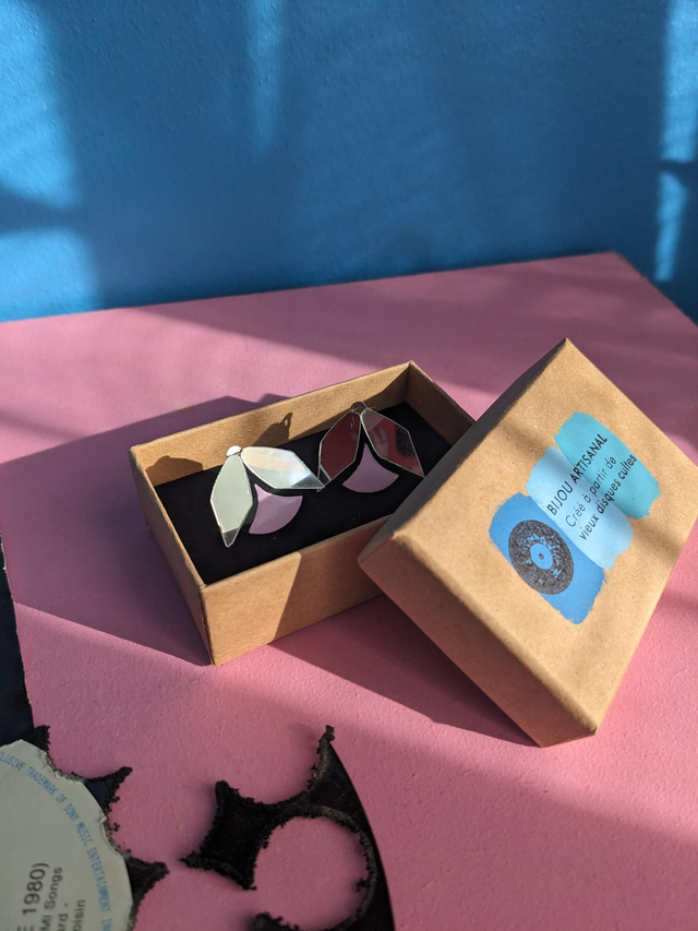 Ces boucles d'oreilles sont fabriquées à partir de vinyles 45T et CD cultes, transformés en bijoux uniques et responsables. Chaque pièce est créée par mes soins dans mon atelier artisanal à Septeuil (78)